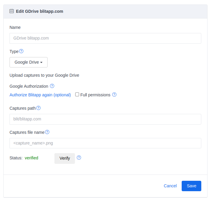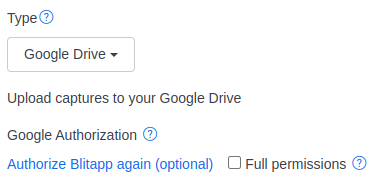 We have created a Blitapp App for Google Drive that lets Blitapp upload screenshots to your account. Create a new App of Type Google Drive. Under Google Authorization, you will get a link to Authorize Blitapp. Click on the link to Authorize Blitapp to upload screenshots to your account.